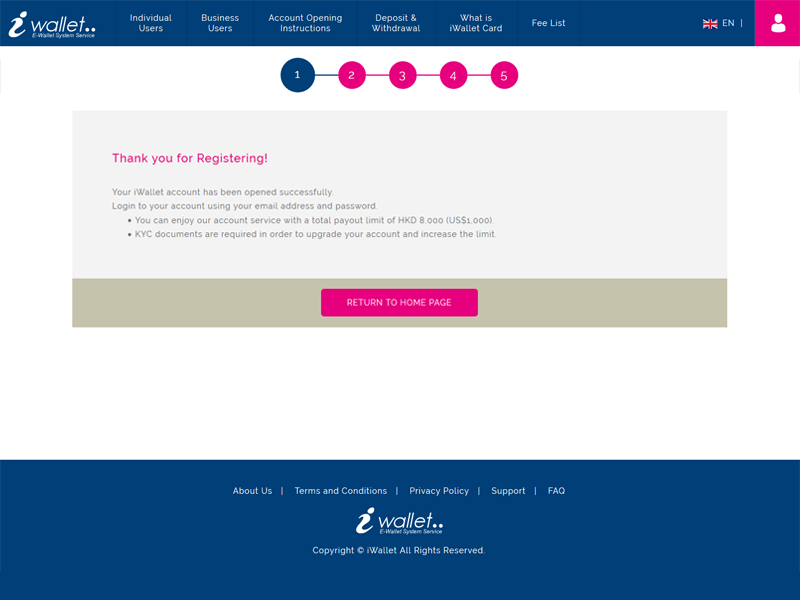 3.您點擊確認郵件內的認證連結或,您的帳戶就開設成功了。在沒有上傳KYC資料的情況下,您帳戶的累計支出上限為USD1,000。